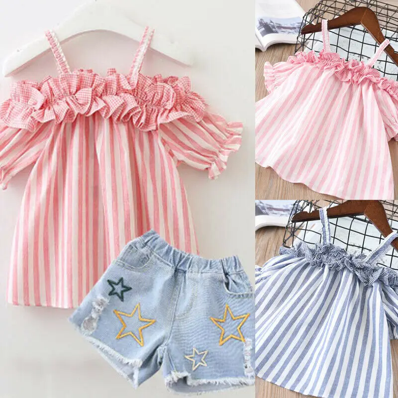 Buy 2Pcs Toddler Baby Kids Girls Clothes Striped Off Shoulder Tops Jeans Shorts Pant 2019 New Summer 2P Right Here and Right Now Just for USD US $5.38, Price will be rise up at any time without notification and I cant guaranted that the stock is still available tommorow or next hour. So Please Save It Now!