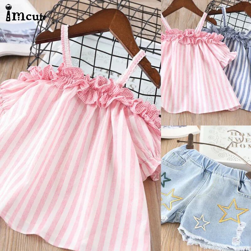 Good Offer for 2Pcs Toddler Baby Kids Girls Clothes Striped Off Shoulder Tops Jeans Shorts Pant 2019 New Summer 2P