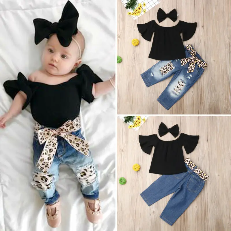 Special Offer for 3PCS 2019 Summer Kids Baby Girls Clothing Sets Off-Shoulder Tops T-Shirt Leopard Ripped Jeans Pants